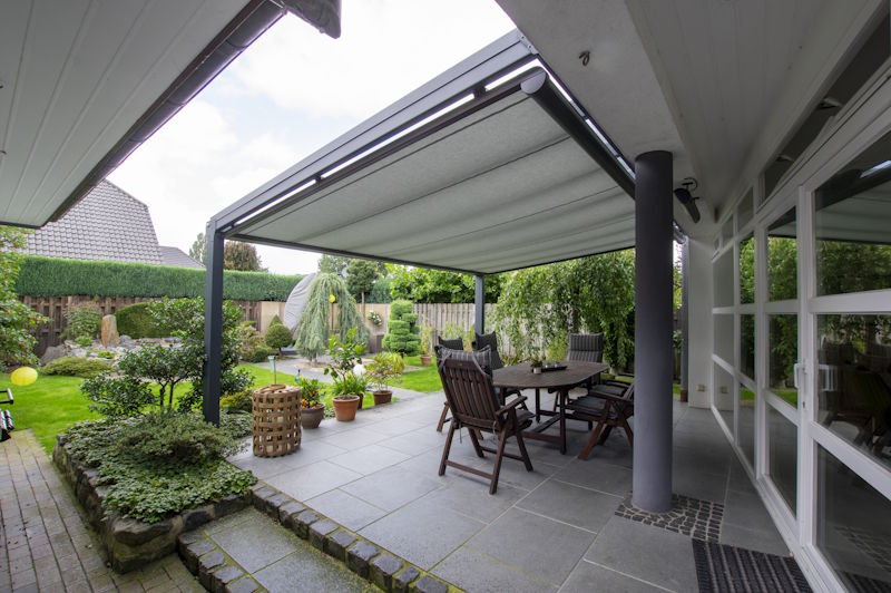 Die wasserdichte Tuchbespannung einer Pergolamarkise wirkt elegant und verleiht Außenbereichen einen Hauch von Luxus. Vor allem größere Freiflächen lassen sich optimal beschatten.