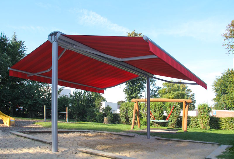 Diese Markise bietet sich an, wenn Sie einen Außenbereich beschatten möchten, der keine direkte Verbindung zu einem Gebäude hat. Vor allem für größere Flächen ist eine freistehende Markise die ideale Lösung.
