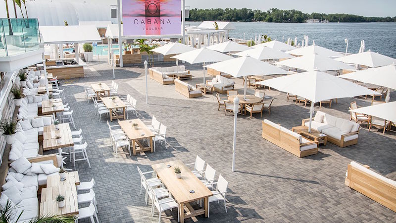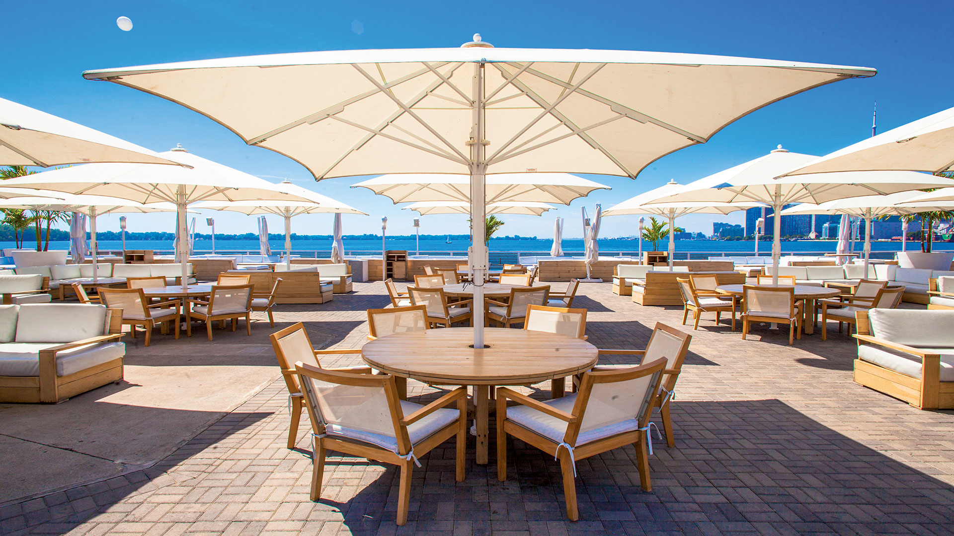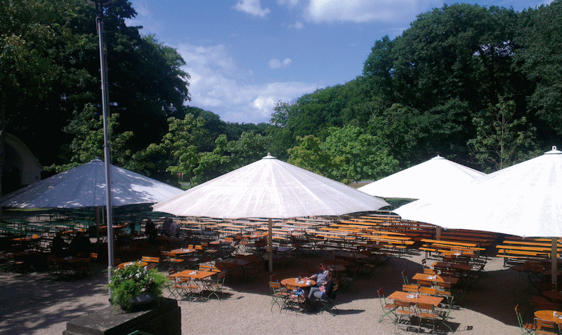 Mit wind- und wetterfesten Bespannungen schützen Großschirme vor intensiver Sonneneinstrahlung und leichtem Regen.